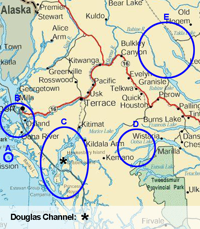 The fact that small islands on the coast such as Bonilla at circle“A” (off banks island), Stephens and Porcher islands at circle “B”