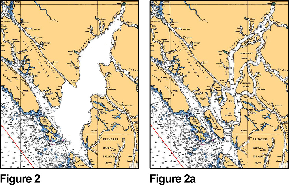 Reinforcing this, figure two shows how a Canadian government marine chart would look if the islands Enbridge removed didn’t exist. Figure 2a is the same chart, intact. | |