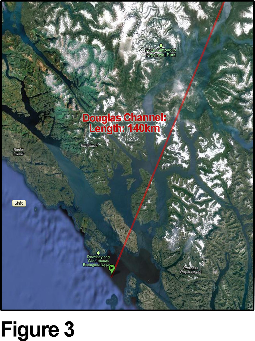The scale of Enbridge’s misrepresentation is put into context in figure three, which shows the geographical length of Douglas channel, as one hundred and forty kilometers long. |